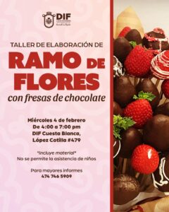 TALLER DE ELABORACIÓN DE RAMO DE FLORES CON FRESAS DE CHOCOLATE Miércoles 4 de febrero De 4:00 a 7:00 p.m. DIF Cuesta Blanca