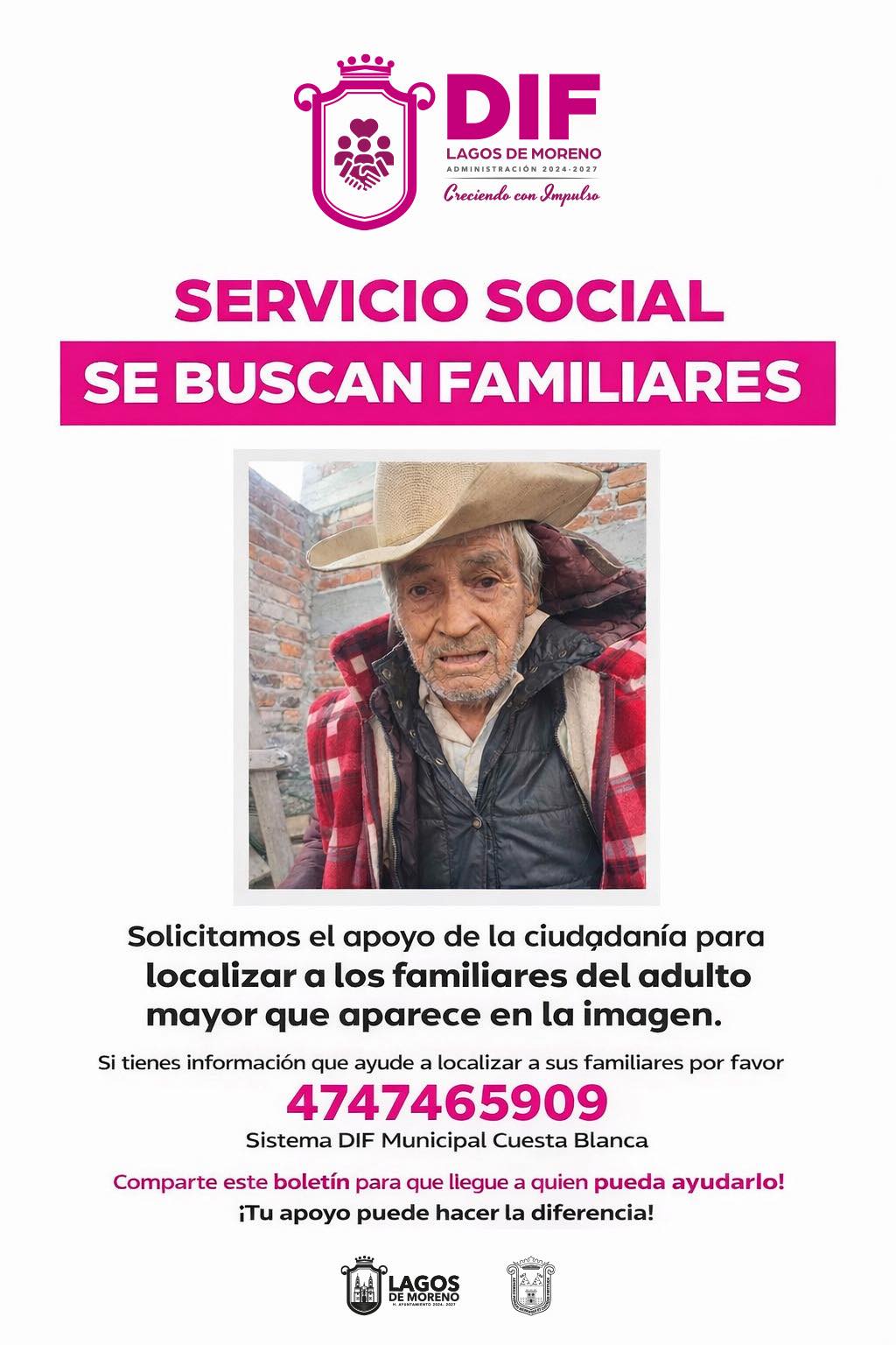 El DIF Cuesta Blanca solicita el apoyo de la ciudadanía para localizar a los familiares del adulto mayor que aparece en la fotografía.